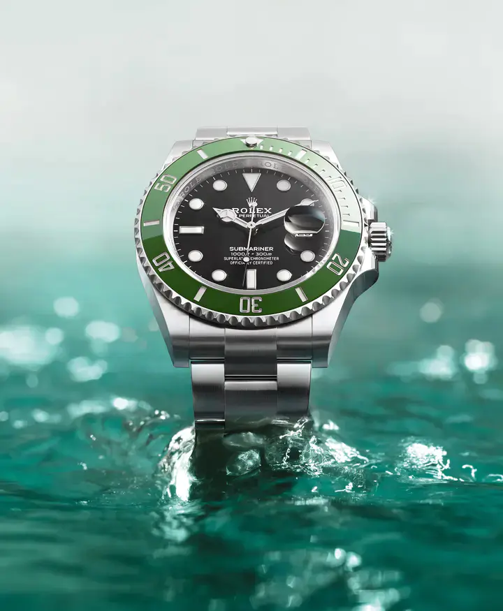 Launched in 1953, the Rolex Submariner is the first divers’ wristwatch to be waterproof to a depth of 100 metres (330 feet) – now 300 metres (1,000 feet). Its major features, such as the graduated rotatable bezel, the luminescent display, the large hands and hour markers, have been a driving force in the creation of the long line of Rolex divers’ watches which followed.