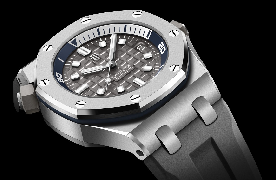Grey dial with “Méga Tapisserie” pattern, white gold applied hour-markers and Royal Oak hands with luminescent coating, blue rotating inner bezel with zone from 60 to 15 minutes in white