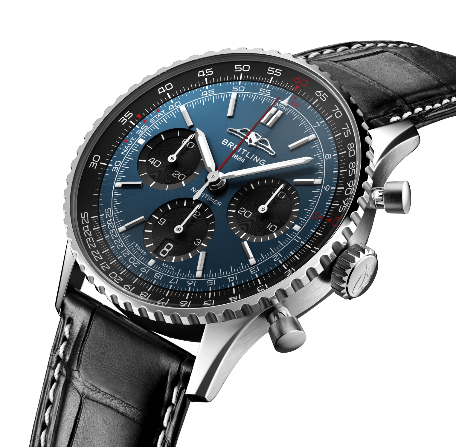 Breitling’s iconic pilot’s chronograph – for the journey. In 1952, Willy Breitling developed a wrist-worn chronograph with a circular slide rule that would allow pilots to perform all necessary flight calculations. Two years later, the Aircraft Owners and Pilots Association (AOPA) announced the design as its official timepiece. The “navigation timer” – or Navitimer – was born. The AOPA was (and remains) the largest pilots’ club in the world, counting nearly every US aviator among its ranks. As the defacto pilot’s watch throughout the glory days of civil aviation, the Navitimer was worn by airline captains and aircraft enthusiasts. It even made its way into space on the wrist of astronaut Scott Carpenter in 1962. And it wasn’t only pilots drawn to the watch’s irrepressible aesthetic. Celebrities of the day such as Miles Davis and Serge Gainsbourg were devotees, proving that the Navitimer had style as well as function. There have been many iterations of Breitling’s icon since its debut 70 years ago, but this new Navitimer captures its most classic features, while enhancing them with modern refinements. A flattened slide rule and a domed crystal create the illusion of a sleeker profile. Alternating polished and brushed metal elements give a lustrous, yet understated finish. Most notably, new colors in shades of blue, green and copper, define the updated dial options. And if there is one update sure to spark nostalgia, it’s the return of the AOPA wings to their original position at 12 o’clock. For 70 years, Breitling’s original pilot’s watch has been beloved by aviators and tastemakers in equal measure. Worn by astronauts in space and the biggest stars on earth, it is Breitling’s most iconic timepiece and one of the most recognizable watches of all time.