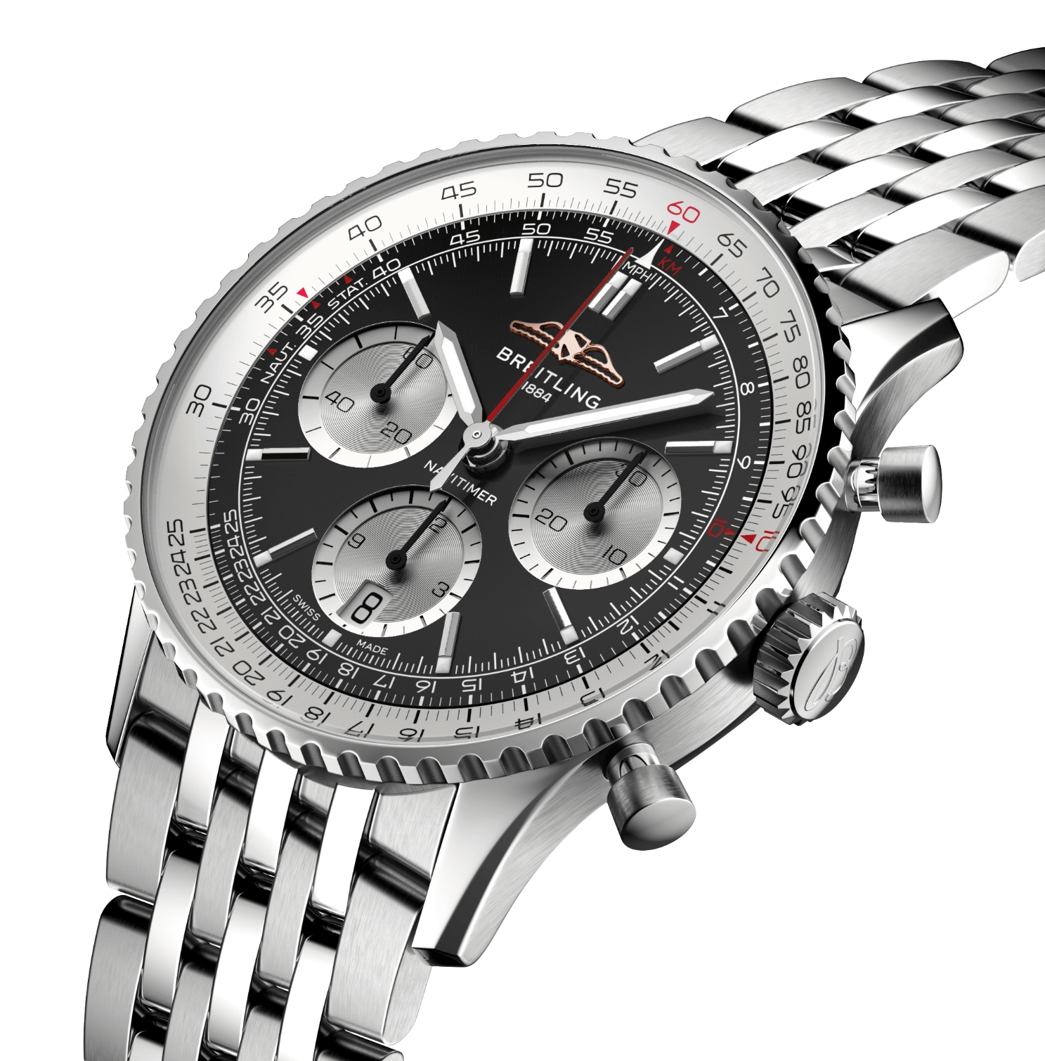 Breitling’s iconic pilot’s chronograph – for the journey. In 1952, Willy Breitling developed a wrist-worn chronograph with a circular slide rule that would allow pilots to perform all necessary flight calculations. Two years later, the Aircraft Owners and Pilots Association (AOPA) announced the design as its official timepiece. The “navigation timer” – or Navitimer – was born. The AOPA was (and remains) the largest pilots’ club in the world, counting nearly every US aviator among its ranks. As the defacto pilot’s watch throughout the glory days of civil aviation, the Navitimer was worn by airline captains and aircraft enthusiasts. It even made its way into space on the wrist of astronaut Scott Carpenter in 1962. And it wasn’t only pilots drawn to the watch’s irrepressible aesthetic. Celebrities of the day such as Miles Davis and Serge Gainsbourg were devotees, proving that the Navitimer had style as well as function. There have been many iterations of Breitling’s icon since its debut 70 years ago, but this new Navitimer captures its most classic features, while enhancing them with modern refinements. A flattened slide rule and a domed crystal create the illusion of a sleeker profile. Alternating polished and brushed metal elements give a lustrous, yet understated finish. Most notably, new colors in shades of blue, green and copper, define the updated dial options. And if there is one update sure to spark nostalgia, it’s the return of the AOPA wings to their original position at 12 o’clock. For 70 years, Breitling’s original pilot’s watch has been beloved by aviators and tastemakers in equal measure. Worn by astronauts in space and the biggest stars on earth, it is Breitling’s most iconic timepiece and one of the most recognizable watches of all time.