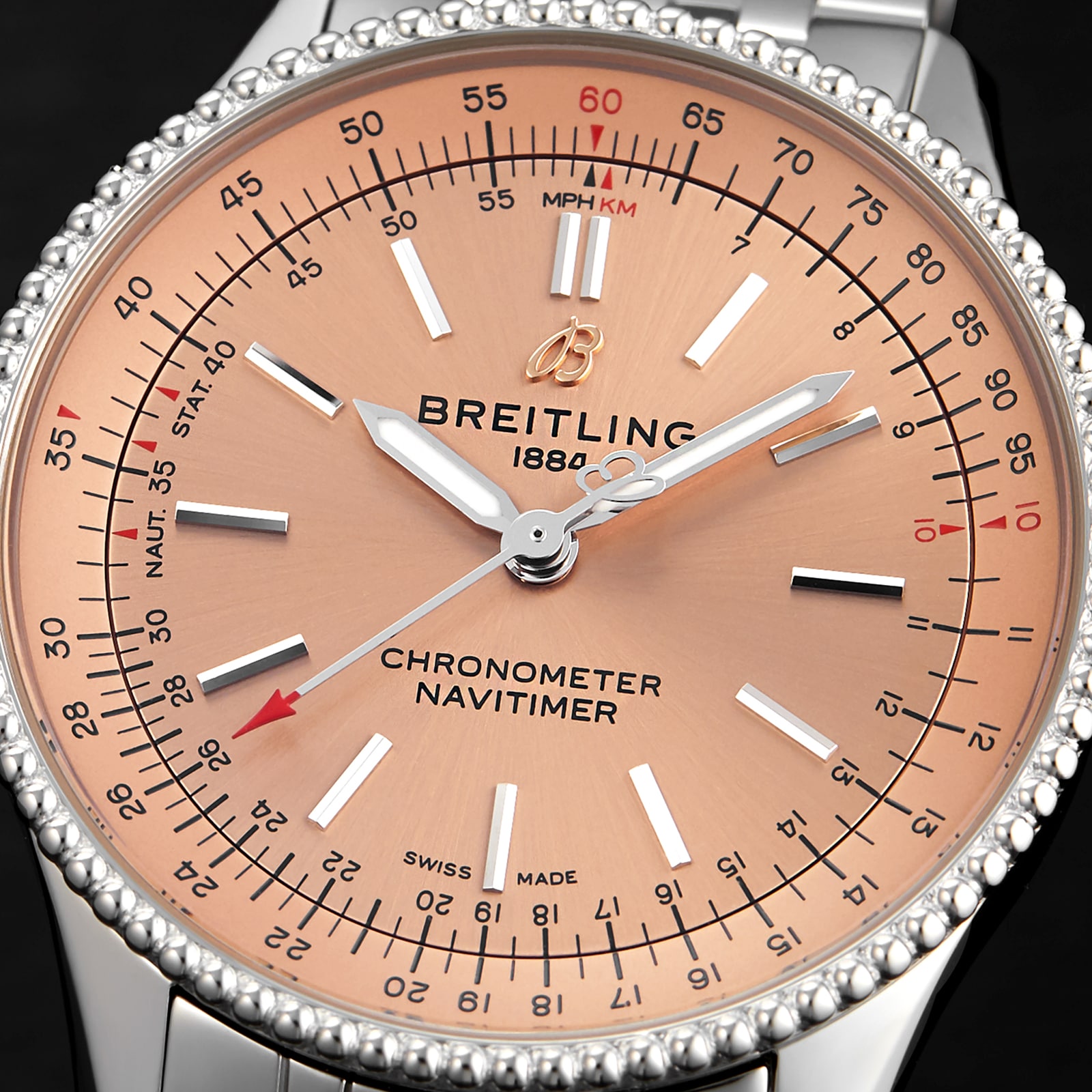 This Navitimer 35mm timepiece features a timeless Breitling design, with a classic stainless steel case and elegant copper dial.