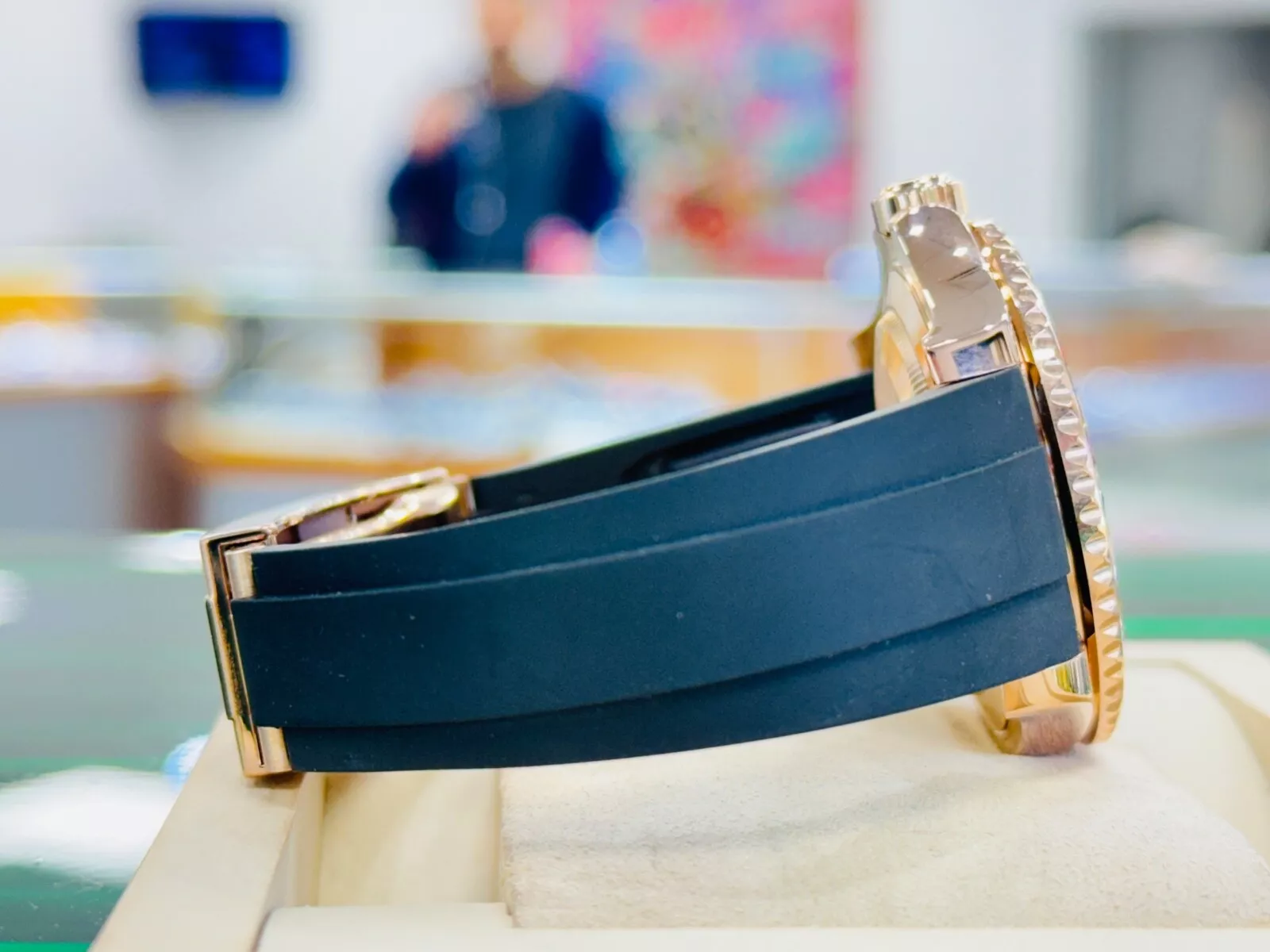 Rolex Oyster Perpetual Yacht-Master 40 mm 18k Everose Gold with Bidirectional Rotatable Gem-Set Bezel features 32 Sapphires, 8 tsavorites and one Diamond and Diamonds Pave Dial with Everose Gold Luminous Hands and Luminous Hour Markers. Oyster case is Stainless Steel with Screw-Down Crown and antireflective Sapphire Chrystal with Magnifier – Cyclops Lens. The date indicator located on 3 o’clock. The watch has Matt Black Oysterflex bracelet with 18k Everose Gold Oysterlock.