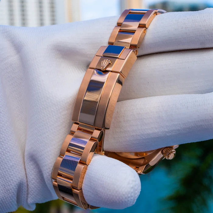 – Oyster design, flat three-piece links – 5 Layer 18k Rose Gold Plated Solid 904L Grade Stainless Steel bracelet – Solid threaded screws, so you can easily remove bracelet links with just a small screwdriver – Folding OysterLock Safety Clasp with Easylink 5 mm Comfort Extension System, exactly as Original
