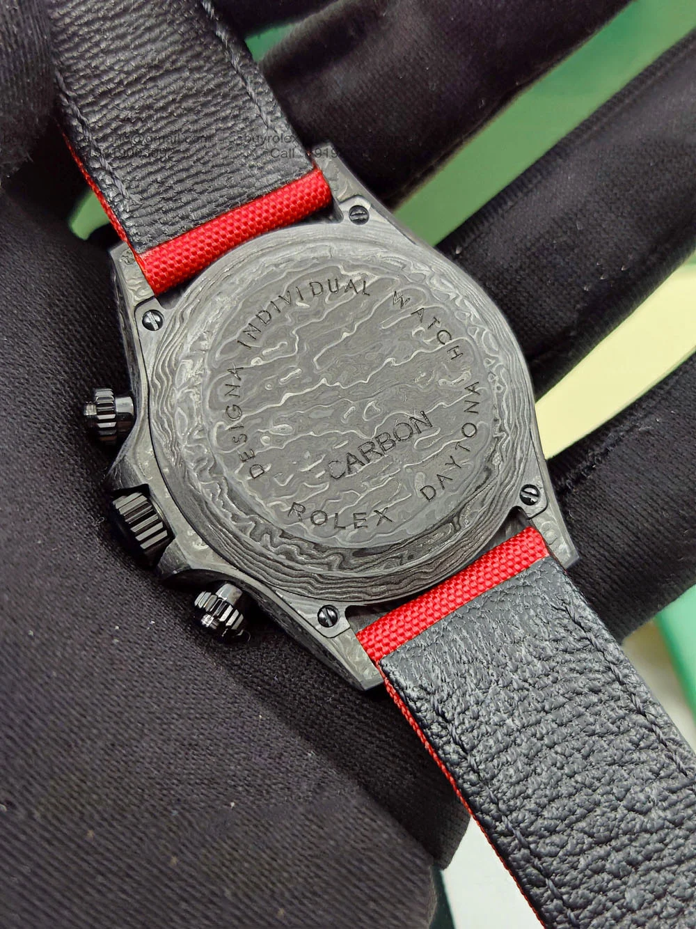 | Please Note: This is a Custom Made Rolex Daytona Super Clone made of Real forged Carbon Fiber. The use of Carbon case makes this watch the lightest Daytona ever produced | |