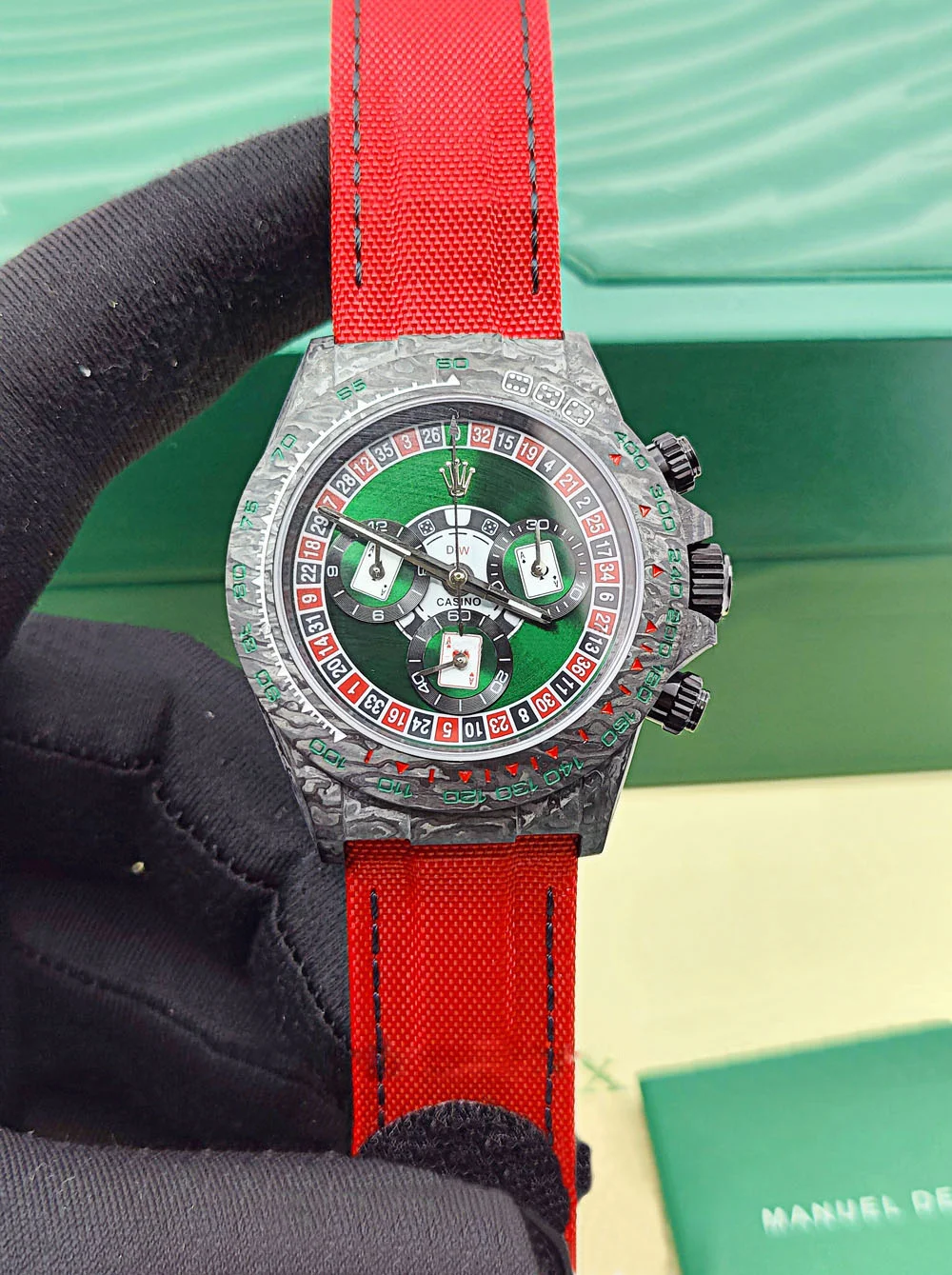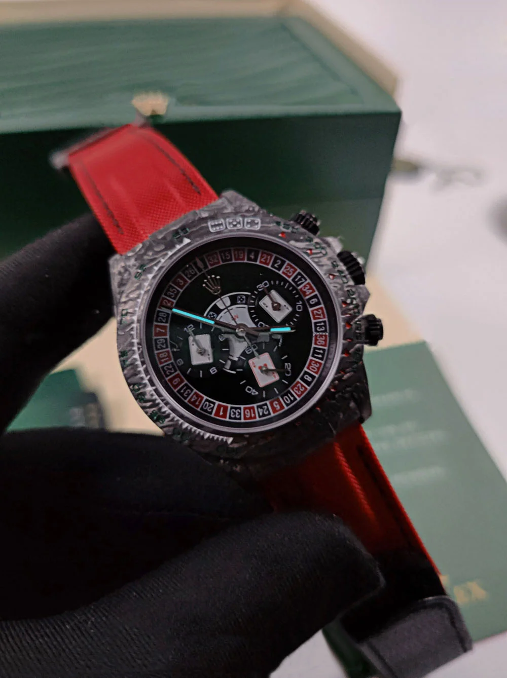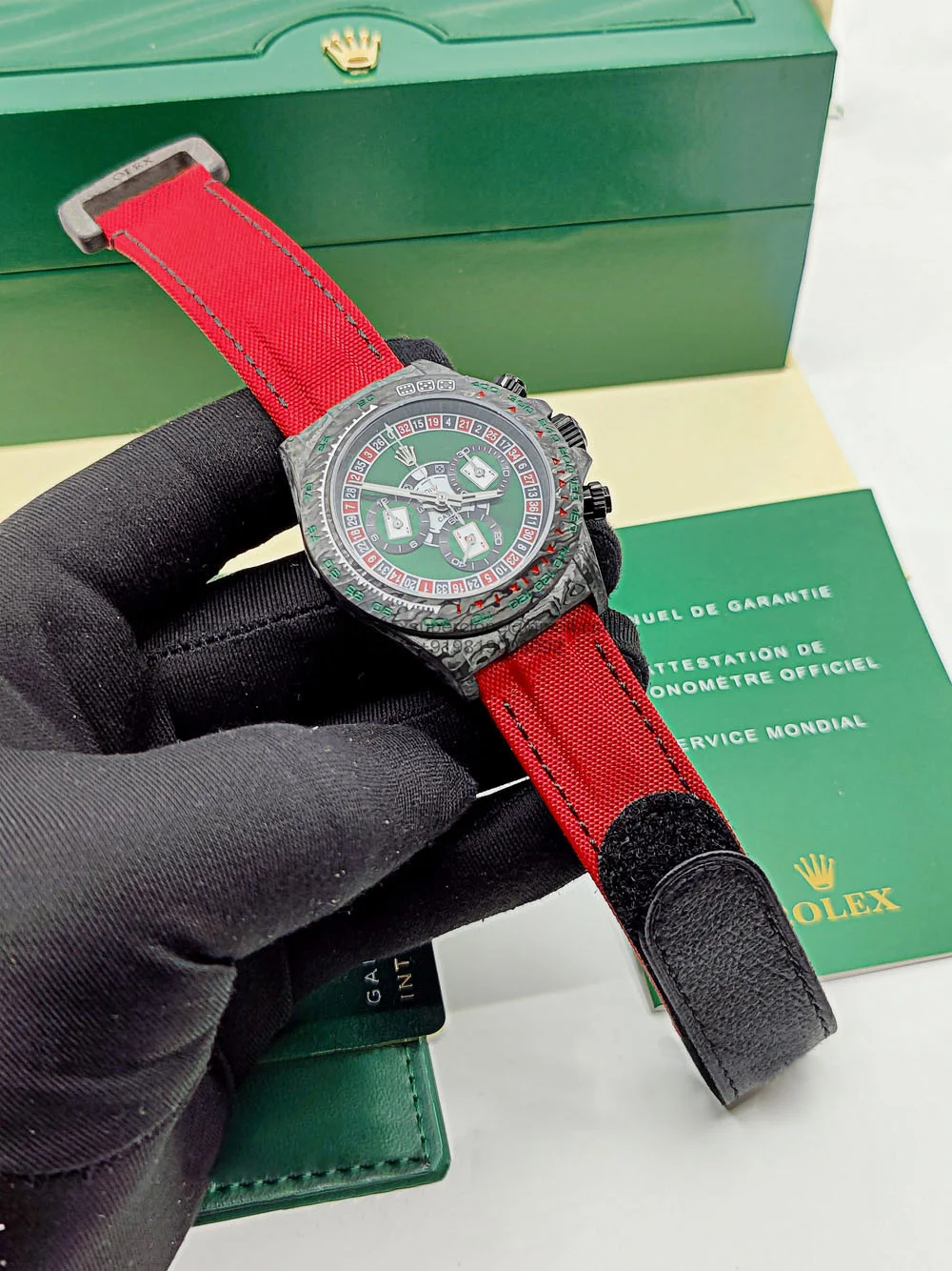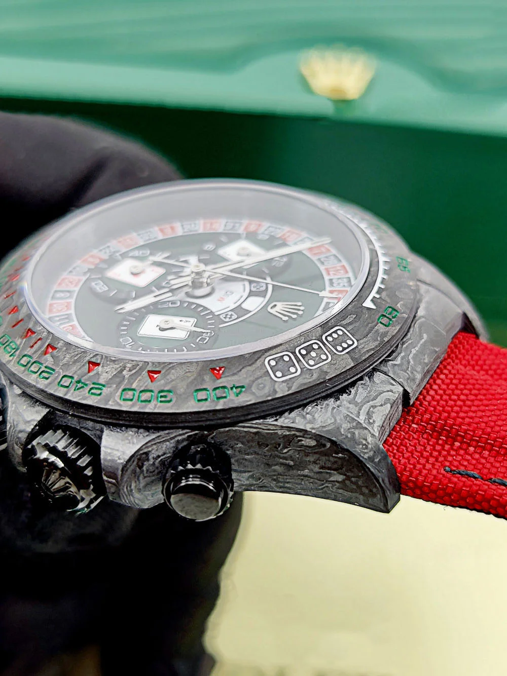 | CASE | – 40mm Oyster Case made of real Carbon Fiber – It is the Lightest Daytona ever produced with less than 50 grams of weight – Screw-Down Winding Crown – ROLEX ROLEX Laser Engraving on Rehaut Ring with Correct Alignment – Dimensions and Weight is Exact 1:1 Identical with Original |