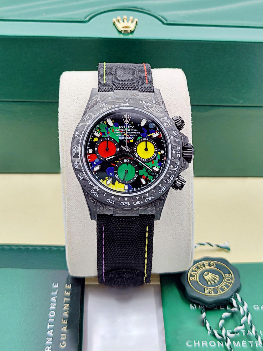 • Rolex Cosmograph Daytona DIW Carbon Motley Multicolour Dial Super Clone Swiss Replica Watch | Custom Made Limited Edition |