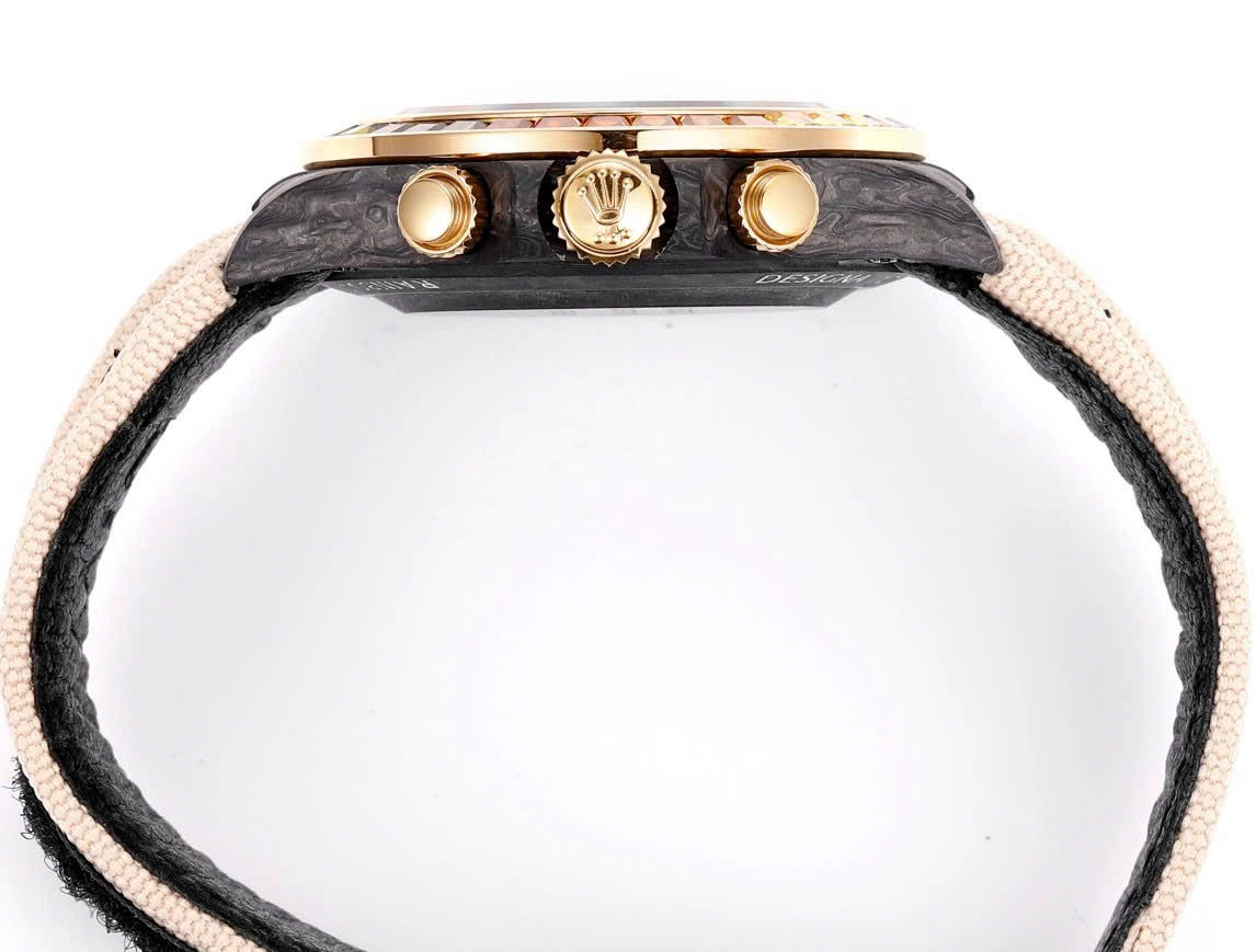 | CASE | – 40mm Oyster Case made of real Carbon Fiber – It is the Lightest Daytona ever produced with less than 50 grams of weight – Screw-Down Winding Crown – ROLEX ROLEX Laser Engraving on Rehaut Ring with Correct Alignment – Dimensions and Weight is Exact 1:1 Identical with Original |