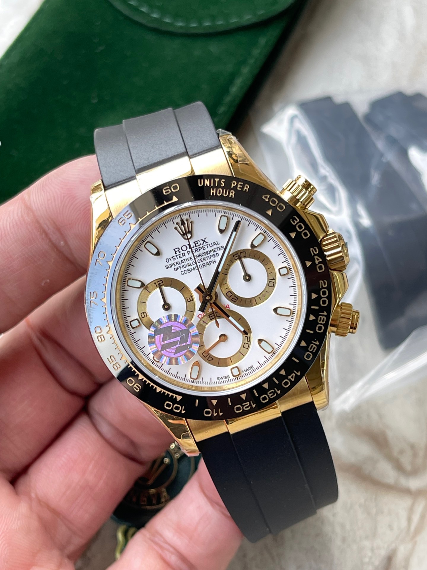 The Daytona’s chronograph feature functions are activated by pushers that screw down like the winding crown when they are not in use, guaranteeing waterproofness to 100 metres. One press to start, stop or reset the chronograph produces a crisp, clear click that was perfected using the most advanced technology. watchmakers also perfected the mechanism to suit the ideal finger pressure on the pushers, and engineered it to provide an instantaneous and accurate start to the timing without sacrificing reliability.