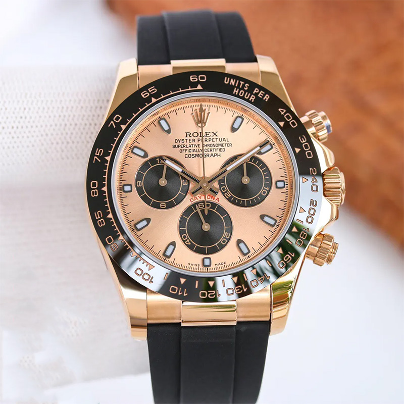 The Daytona’s chronograph feature functions are activated by pushers that screw down like the winding crown when they are not in use, guaranteeing waterproofness to 100 metres. One press to start, stop or reset the chronograph produces a crisp, clear click that was perfected using the most advanced technology. watchmakers also perfected the mechanism to suit the ideal finger pressure on the pushers, and engineered it to provide an instantaneous and accurate start to the timing without sacrificing reliability.