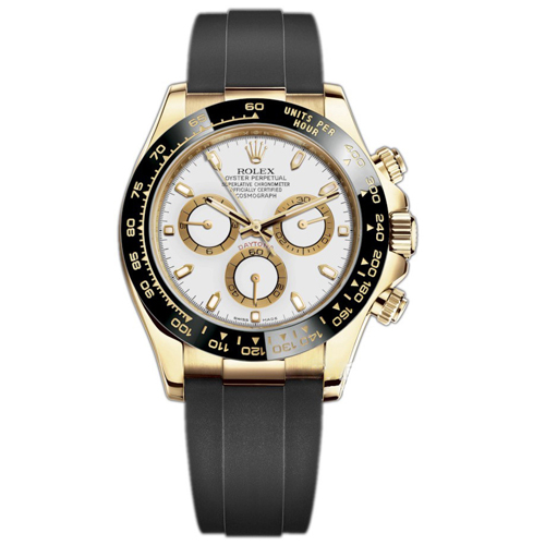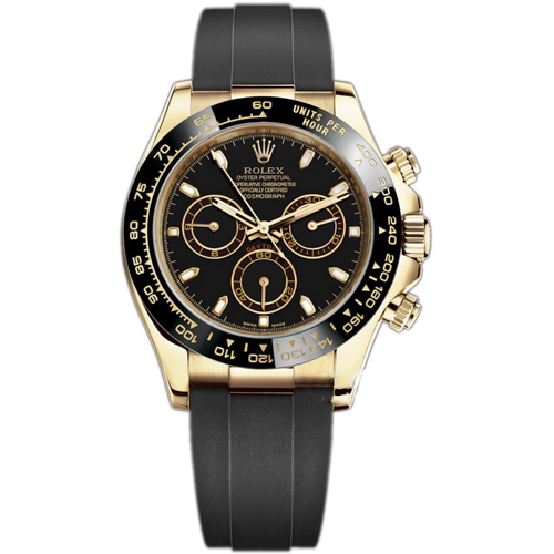 Rolex Cosmograph Daytona, 18k Yellow Gold 40mm watch, Reference 116518ln-0048. This model has Champagne/gold colored dial with black sub-dials. Applied black rimmed index hour markers with luminous fill. Polished 18k Yellow Gold hour and minute hands with black centerline and partial luminous fill. Fine printed minute/seconds and fractions of a second track on teh dial perimeter. Polished 18kt Yellow Gold screw-down crown with Rolex's patented "Triplock" triple waterproofness system, ensuring that the crown screws down against the Oyster case as securely as a submarine hatch. Screw-down chrono buttons in polished 18kt Yellow Gold. The dial closed by a Scratch-resistant Sapphire Crystal and solid 18kt Yellow Gold made case back. Chronograph/Stop watch function: large central seconds counter hand - accurate up to 1/8th of a second; 30-minute counter sub-dial located at the 3 o'clock position; 12-hour counter sub-dial located at the 9 o'clock position. Continuous running small seconds hand sub-dial located at the 6 o'clock position. The watch is equipped Black "Cerachrom" bezel, made of highly durable ceramic that is extremely hard, highly scratch-resistant, has excellent corrosion resistant properties and is unaffected by ultraviolet rays so the color will not fade. Yellow gold-filled engraved tachymeter scale on the bezel. The watch is mechanical chronograph; self-winding Manufacture Rolex 4130 contains 44 Jewels and has an approximate power reserve of 72 running the time only, or 66 hours with the chronograph function running. This model presented on Oysterflex strap of Flexible metal blades overmoulded with high-performance elastomer and a Folding Oysterlock safety clasp with Easylink 5 mm comfort extension link. The water resistance is up to 100m/330ft (10 ATM).