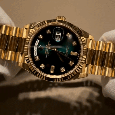 • This product is out of stock. If you need to purchase it, please contact us to customize it.ROLEX Day-Date 40 Green Ombre Diamond Dial Yellow Gold President Automatic Watch 128238