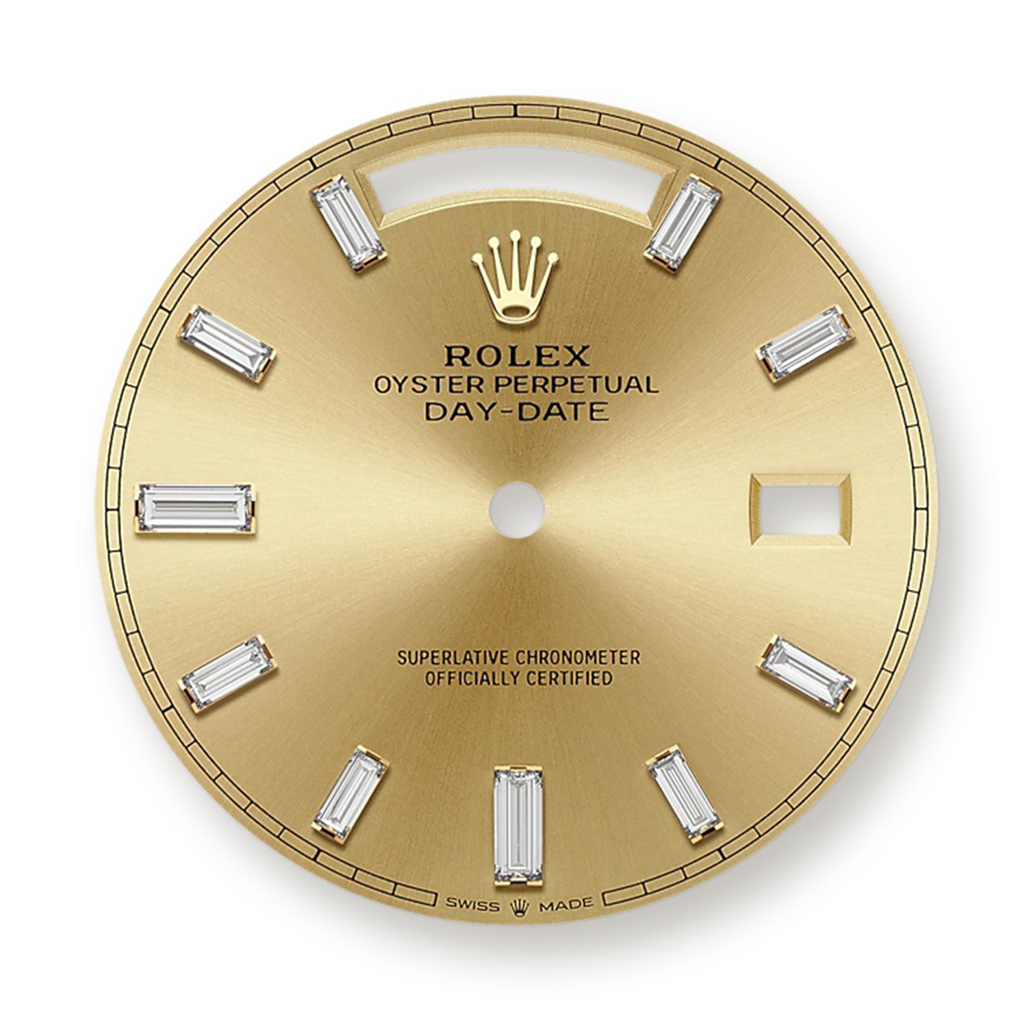 The self-winding Rolex Day-Date 40 is showcased here in 18ct yellow gold, with a 40mm diameter, mono-bloc middle case screw-down case back, and winding crown with Twinlock double waterproofness system.?Complementing the case is the Champagne coloured dial with its stunning 10 baguette diamond hour markers, which is protected by a scratch-resistant sapphire with a cyclops lens over the date.? The power behind this timepiece is the Caliber 3255, Manufacture Rolex which offers functions that include center hour, minute and seconds hands, instantaneous day and date in apertures, unrestricted rapid settings, and stop-seconds for precise time setting. It has a power reserve of approximately 70 hours and is water-resistant up to 100 meters / 330 feet, and further enhanced by the application of the President bracelet with its semi-circular three-piece links in 18ct yellow gold and secured with a concealed folding Crownclasp.