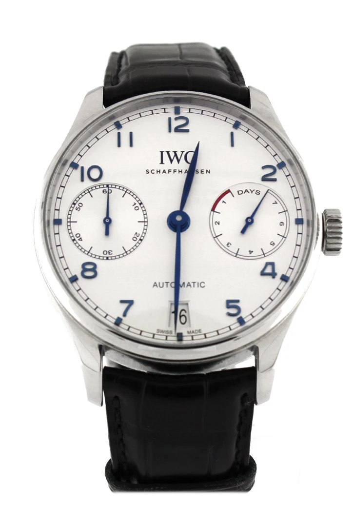 Stainless steel case with a black alligator leather strap. Fixed stainless steel bezel. Silver dial with blue hands and Arabic numeral hour markers. Minute markers around the outer rim. Dial Type: Analog. Date display at the 6 o'clock position. Two sub-dials displaying: 7 day power reserve and 60 second. Automatic movement with a 168-hour power reserve. Scratch resistant sapphire crystal. Push / pull crown. Skeleton case back. Case diameter: 42.3 mm. Case thickness: 14.5 mm. Round case shape. Fold over clasp with safety release. Water resistant at 30 meters / 100 feet. Functions: date, hour, minute, second. Luxury watch style. Watch label: Swiss Made. IWC Portugieser Automatic Black Strap Mens Watch