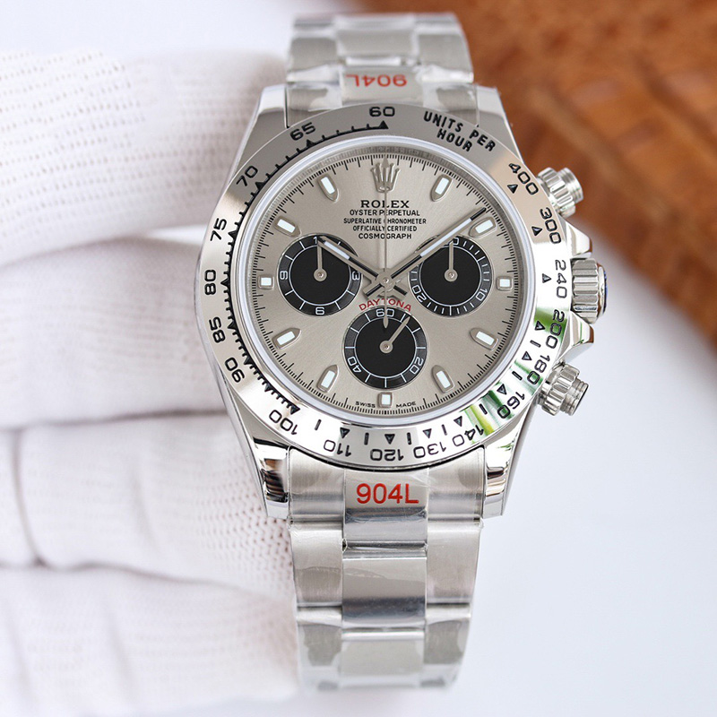 Daytona Swiss replica watches looks and function identical to a genuine Rolex. Our Swiss cloned Rolex chronograph movements feature every Rolex engraving, serial numbering and are lubed with Nano-oil Swiss lubricants and are designed to last a lifetime. Visually and functionally our chronograph movement 28.000 vibrations per hour offers the same fine sweep seconds hand “Rolex” motion as on the genuine Rolex. Our chronograph sub dials displays the seconds, minutes, hours and both screws down buttons are fully functional for the chronograph start-pause-stop functions.
