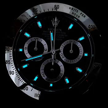 Rolex Daytona Swiss Replica watches are equipped with the new SuperLuminova™ Blue glow luminescent pigment that after sufficient activation by sunlight or artificial light will glow in the dark up to nine hours with uniform luminosity throughout.