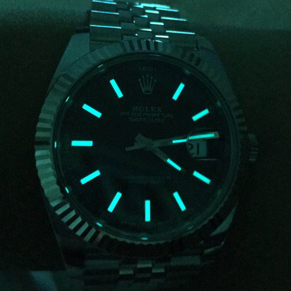 Rolex Datejust Swiss Replica watches are equipped with the new SuperLuminova™ Blue glow luminescent pigment that after sufficient activation by sunlight or artificial light will glow in the dark up to nine hours with uniform luminosity throughout.